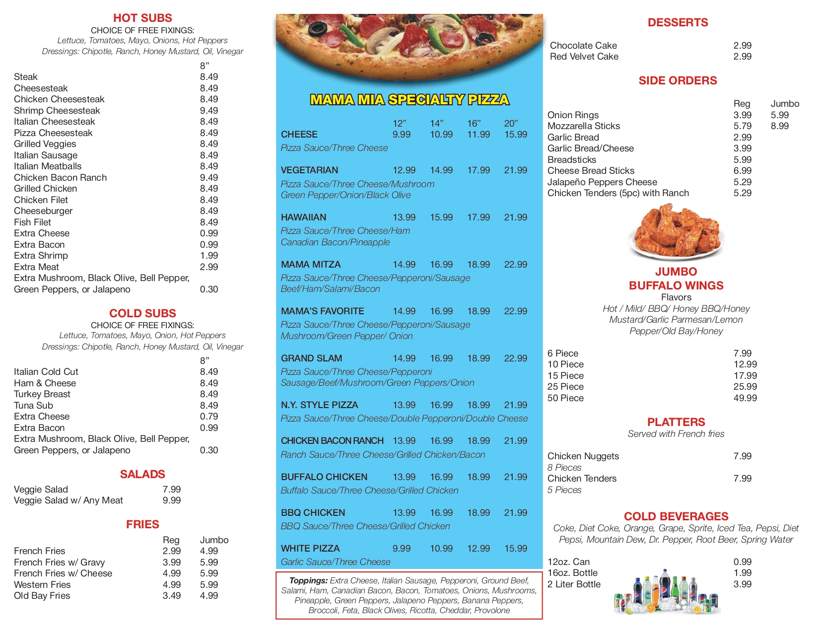 Where flavor meets tradition! At Mama Mia Pizza & Sub, we serve handcrafted pizzas, hearty subs, and fresh sandwiches made with love and quality ingredients. Whether you’re craving a cheesy slice, a loaded sub, or a quick bite, we’ve got something to satisfy every appetite.